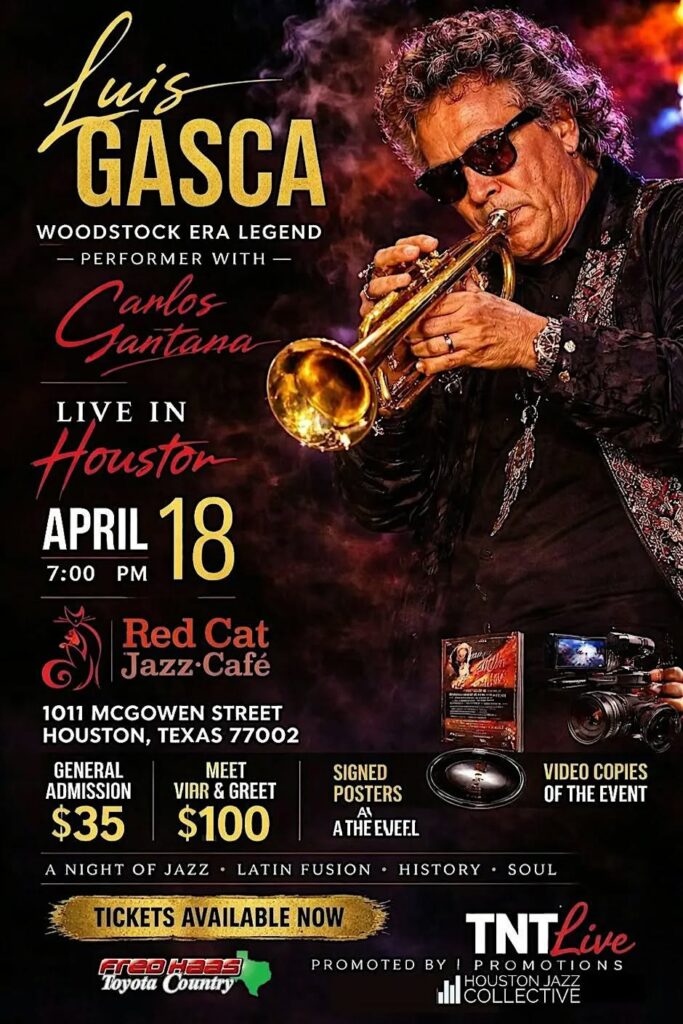 Don’t miss Luis Gasca for one unforgettable night in Houston, bringing decades of musical history and fiery trumpet artistry to the stage.